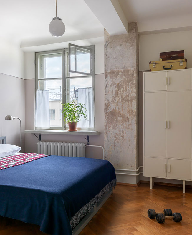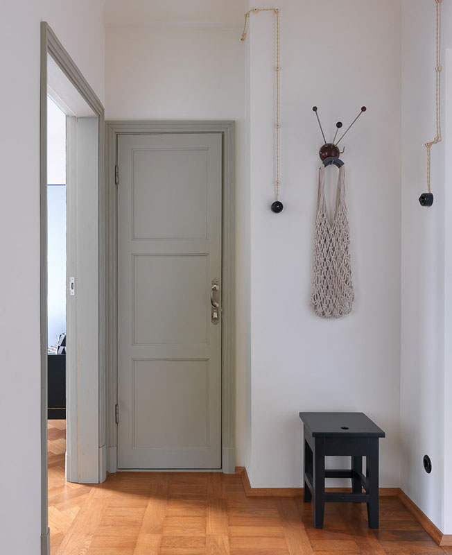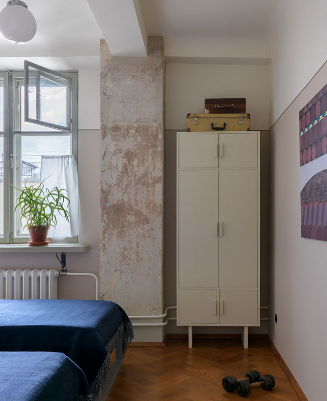 В ходе ремонта были восстановлены многие чудом сохранившиеся элементы первой трети XX века: оконные рамы, межкомнатные двери со стеклянными фрамугами, паркет. Серо-зеленый цвет стен также отсылает к ушедшей эпохе — сложно поверить, но на двух стенах даже сохранилась оригинальная покраска. Еще один интересный элемент интерьера — открытая проводка, которая является яркой приметой времени.
