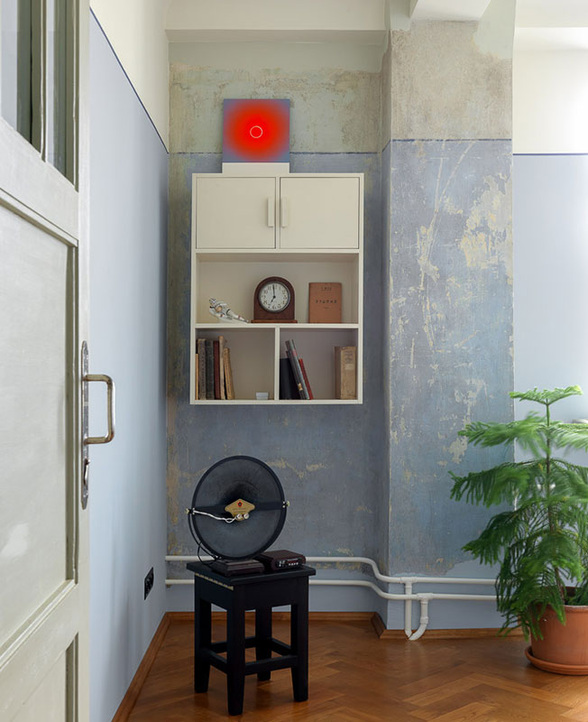 Фрагмент гостиной. Прототип шкафа — предмет из квартиры Николая Милютина в доме Наркомфина. На табурете — советская радиотарелка, Муромский радиозавод.
