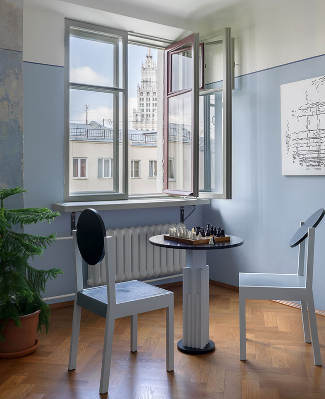 Дизайнер Мария Пилипенко отремонтировала квартиру 35 кв. метров в доме 1930-х годов на Басманной улице в Москве, бережно отреставрировав архитектурные элементы и наполнив аутентичной мебелью. Здание было построено в 1932 году советским архитектором-конструктивистом Иваном Николаевым. Жилой дом для работников Народного комиссариата путей сообщения до сих пор населяют железнодорожники. Фрагмент гостиной. Диван «Черный и красный квадраты», инженер А. И. Фрицлер. Узор обивочной ткани создан по мотивам рисунка Любови Поповой. Фрагмент гостиной. Прототип шкафа — предмет из квартиры Николая Милютина в доме Наркомфина. На табурете — советская радиотарелка, Муромский радиозавод. Мария Пилипенко подчеркивает, что реализованный проект — не стилизация. Основная идея реконструкции — воссоздание обстановки, которая могла бы существовать в начале 1930-х годов. Дизайнер оставила существующую планировку без изменений и провела целое исследование, привлекла специалистов по архитектуре советского авангарда. В проекте принимали участие Александр Дуднев и Константин Гудков, реставраторы Александр Серебряков и Екатерина Дмитриева, директор Центра авангарда на Шаболовке Александра Селиванова. Фрагмент гостиной. Стол и стулья выполнены по эскизам Николая Суетина, студия Less. Картина, Александр Зайцев. Пространство площадью 35 кв. метров включает две комнаты, кухню без окна и крошечный санузел, в котором также удалось оборудовать душ — в квартире не предусмотрена ванная комната и горячая вода. На окнах и дверях сохранилась оригинальная фурнитура. nonehttps://www.instagram.com/mariyapilipenko/?hl=ruhttps://www.facebook.com/maria.pilipenko.9http://www.mp-decor.net/ Коврик создан по рисунку Николая Суетина (1923), ручная работа, вологодский народный мастер. В ходе ремонта были восстановлены многие чудом сохранившиеся элементы первой трети XX века: оконные рамы, межкомнатные двери со стеклянными фрамугами, паркет. Серо-зеленый цвет стен также отсылает к ушедшей эпохе — сложно поверить, но на двух стенах даже сохранилась оригинальная покраска. Еще один интересный элемент интерьера — открытая проводка, которая является яркой приметой времени. Фрагмент спальни. Паттерн пледов повторяет эскизы Варвары Степановой. Предметы мебели создавались по образу реально существующих музейных экспонатов, разрабатывались по чертежам и эскизам советских авангардистов. При этом многие объекты до этого проекта существовали лишь в виде концептов. Например, столы, стулья, кровати и табуреты были созданы по образу моделей, экспонировавшихся на конкурсе советских дизайнеров 1932-го года. Фрагмент спальни. Односпальные кровати сдвигаются в полноценное спальное место для двоих. Прототипом послужил объект «На переходном этапе» Е. И. Гужинской. Фрагменты старой покраски стен были законсервированы с помощью реставратора. Фрагмент спальни. Шкаф выполнен по эскизам 1930-х годов, включает утюг, гладильную доску, фен. Специально для компактного пространства все предметы созданы как трансформеры. Вместо прикроватных тумбочек в спальне сконструированы специальные выдвижные полочки, стол на кухне складывается к стене, диван оборудован откидным подлокотником, который также может увеличивать длину спального места. Кухня. Табуреты «Плебей» по эскизам А. Н. Машкова, студия Less. Кухонный гарнитур и складной столик выполнены из фане