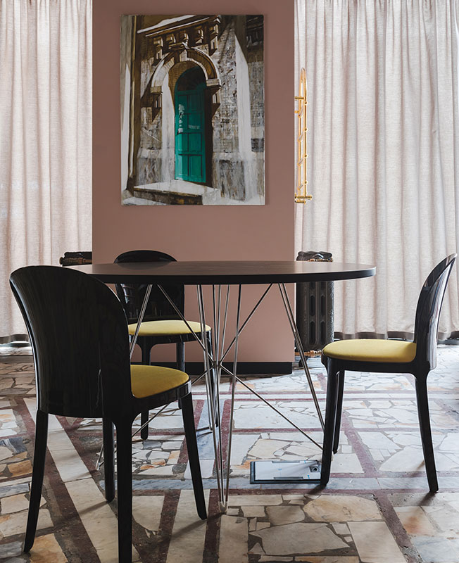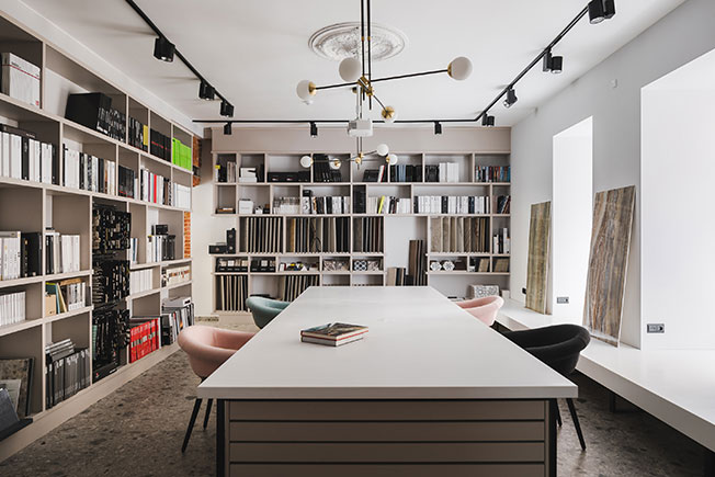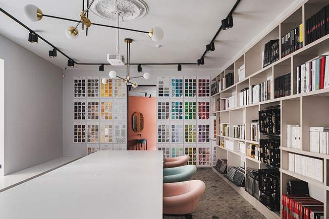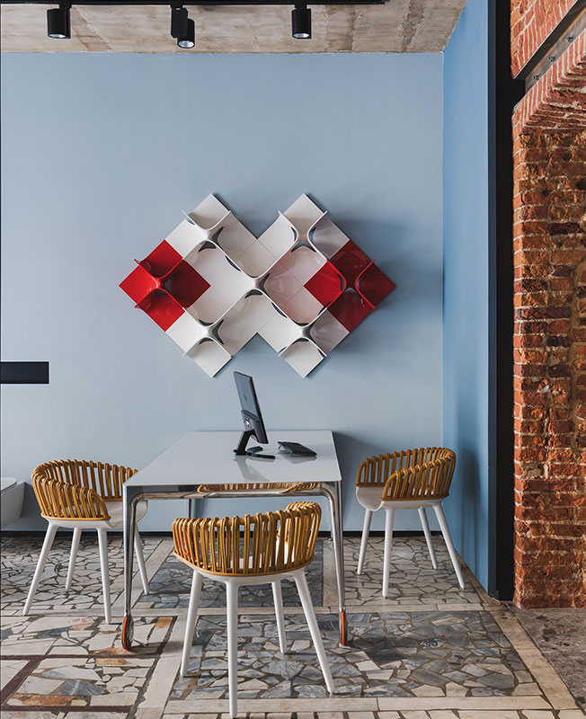 Вторым важным элементом салона стал пол. «Интересно, что когда мы выбирали отделку, терраццо еще не было столь популярно. А когда заканчивали проект, то уже видели его на ведущих стендах Salone del Mobile в Милане», — комментирует Андрей Ююкин.