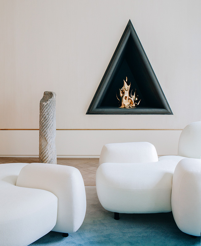 Символ всех тайных обществ, масонский треугольник, в его самой совершенной геометрии, превращен в камин. Выполненный из базальта, камин сам почти становится огнем. Его линии деликатно обрамляют «бронзовое пламя». Формы и отделки взаимодействуют и говорят на общем языке. Кольцо из латуни, вставленное в шерстяной ковер «разговаривает» c бра. Светильник, скрученный в узел, отсылает к шелковой отделке люстры, в то время как палисандровый шкаф резонируют с креслами.