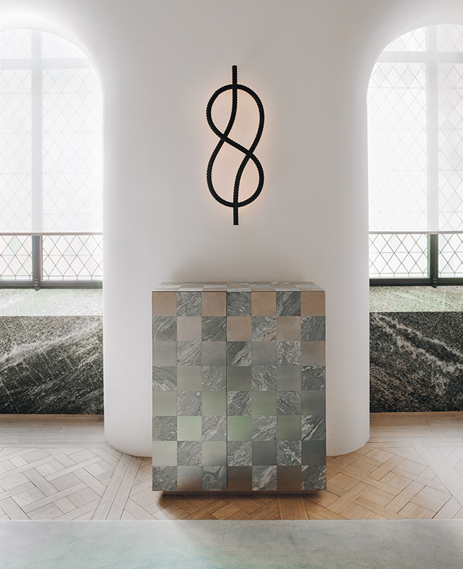 В коллекции выделяются столик-воронка, украшенный маркетри из соломки и роскошный шкаф из мрамора и металла. В патинированном алюминии, латуни традиционные технологии производства вступают в союз с передовыми процессами.