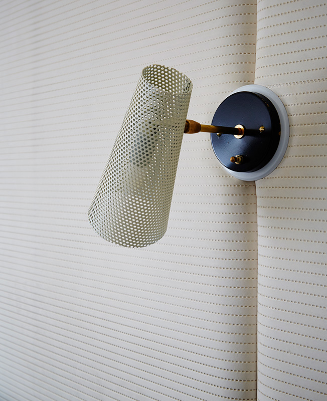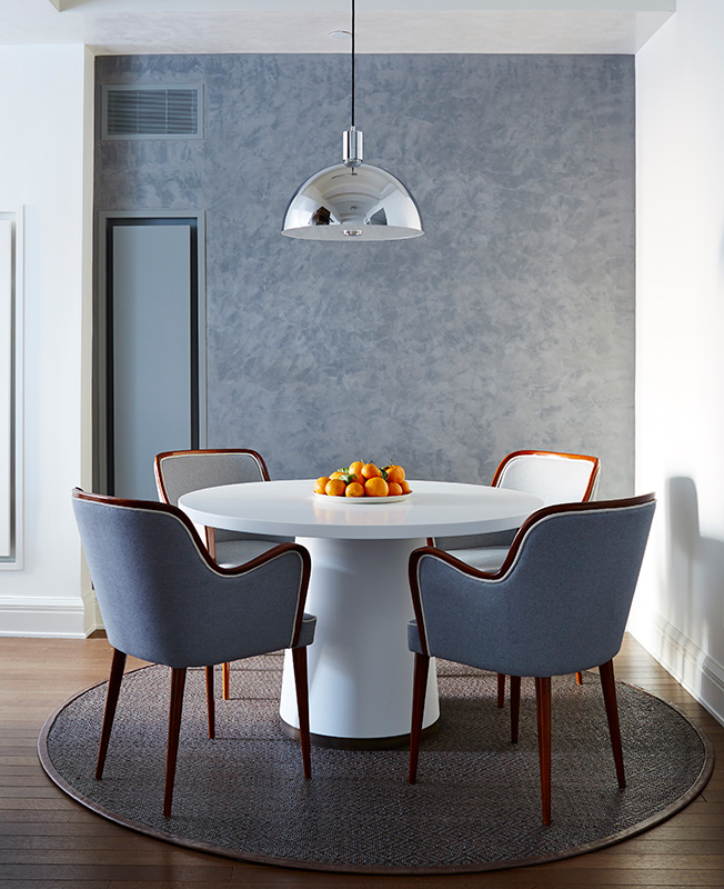 Стеллаж из древесины ореха и бронзы «обернут» вокруг массивной колонны, маскируя ее и визуально отделяя обеденную зону. В столовой стены и потолок отделаны шелковистой венецианской штукатуркой. Круглый стол изготовлен специально для этого проекта из кориана. Вокруг него — стулья 1950-х годов из махагони, спроектированные архитектором Освальдо Борсани. Над столом винтажная лампа Франко Альбини 1960-х годов: за счет подвижной конструкции ее положение можно регулировать.