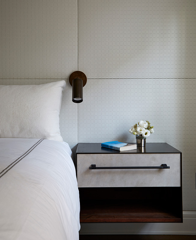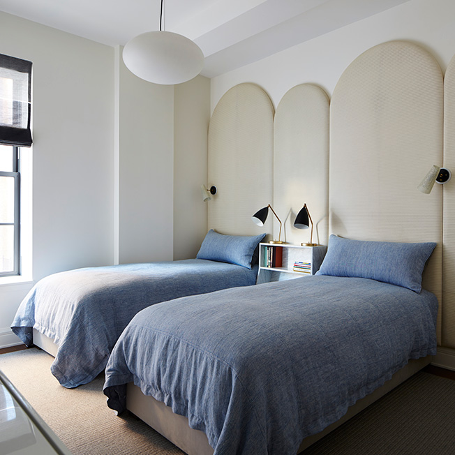 В спальнях минимум мебели и преобладающий белый цвет. Нескучным пространство делают детали: например, масштабные мягкие изголовья, обитые светлой кожей с мелким фактурным рисунком, отделанные мрамором тумбы, латунные акценты, детали синего цвета. Детскую делят между собой брат и сестра — это одна из причин выбора такой палитры: дизайнер хотел создать интерьер гендерно нейтральным, чтобы обоим детям было комфортно.