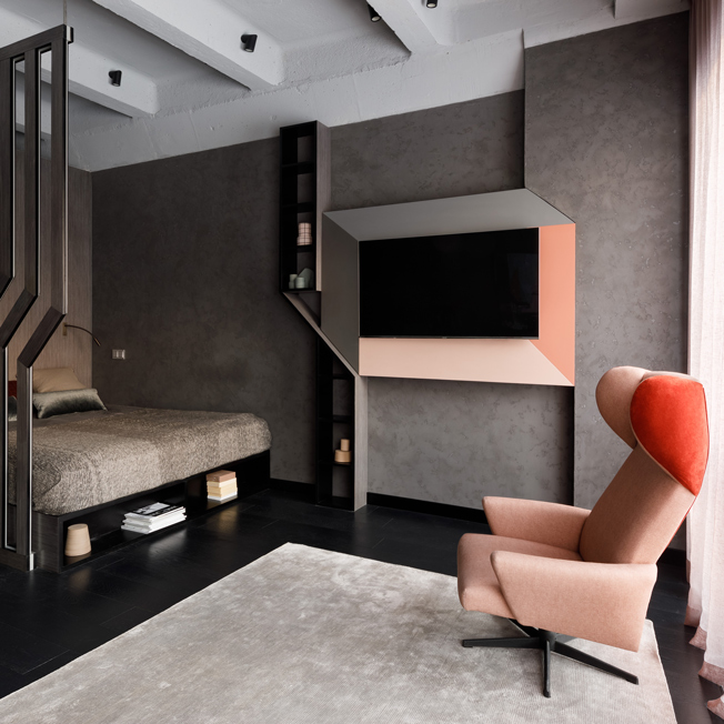 Ирина Маркман и Екатерина Нечаева, BHD-Studio, оформили в Москве квартиру площадью 40 кв. м. Кровать, панели вокруг ТВ, стеллаж изготовлены на заказ по чертежам дизайнеров. Кресло было найдено на блошином рынке в Праге и переобито в современный текстиль.