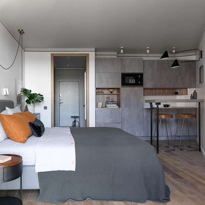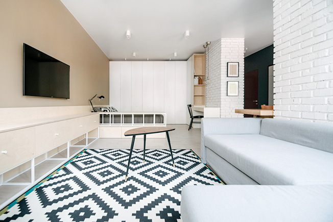 INT2architecture: квартира-студия для сдачи в аренду. Небольшое пространство планировали специально для сдачи в аренду. Вложения в отделку (как в материалы, так и в работы) были минимальными.