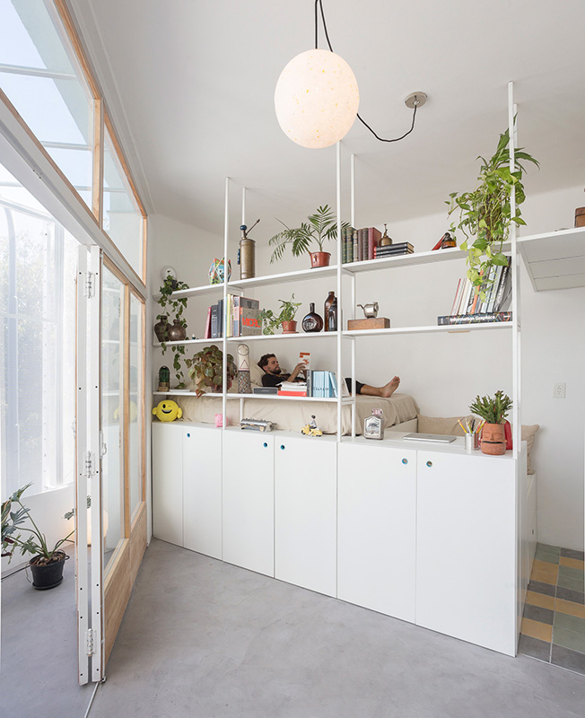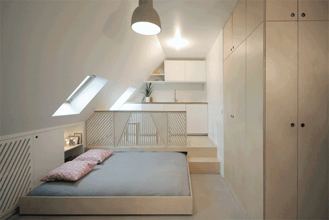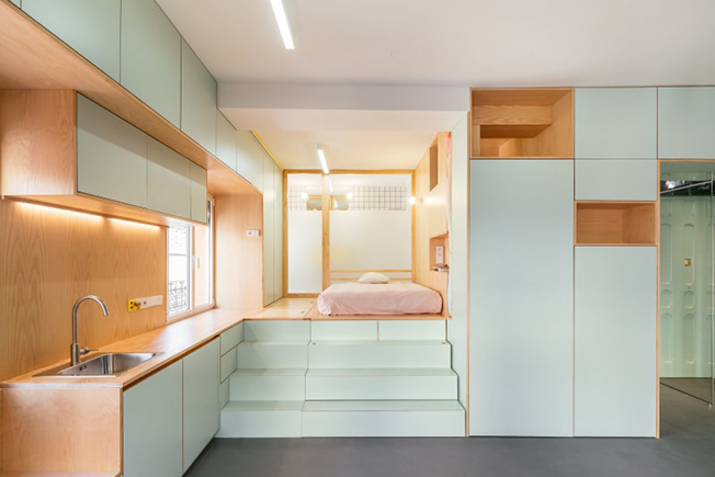 Elii Architects. Мини-квартира состоит из двух уровней: первый — на высоте входа и главной комнаты, а второй — на 90 сантиметров выше первого, который выходит за пределы кухонной поверхности. Здесь располагаются ванная комната и зона отдыха.