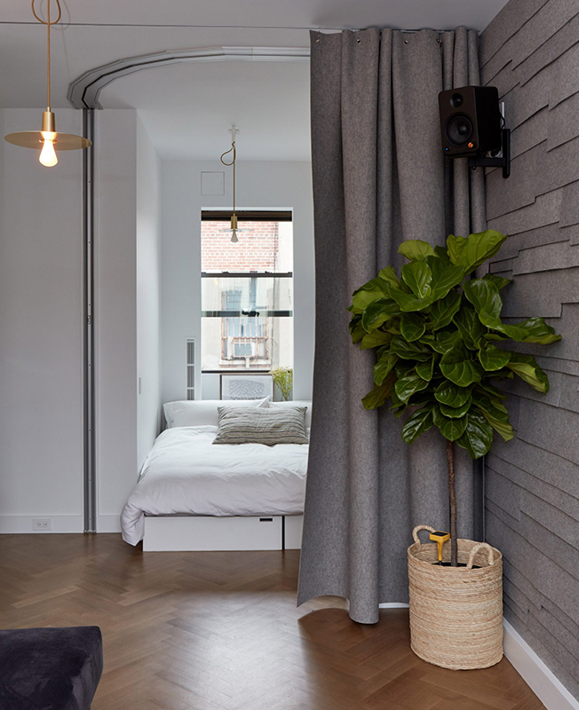 Рик Джой, Studio Rick Joy, спроектировал квартира-студия в Нью-Йорке. Двуспальная кровать оформлена двуслойным пологом из черного и белого льна: четыре занавеса можно сдвинуть, превратив спальное место в уютный кокон.