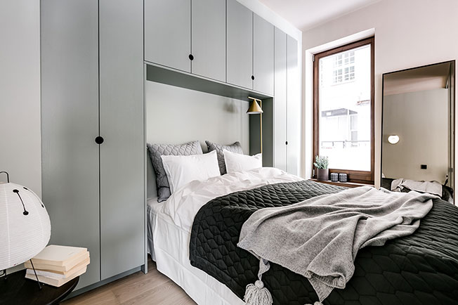 Note Design Studio спроектировала маленькие квартиры в cтокгольмской новостройке. Спальня оснащена двумя раздвижными дверями, которые обеспечивают доступ с обеих сторон кровати. Сверху изголовье обрамлено системой хранения, отделанной шпоном, с круглыми врезанными ручками, разработанными Note.