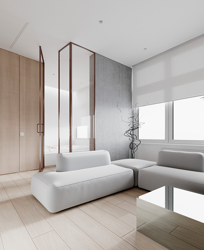 Архитекторы бюро М3 Architects спроектировали интерьер маленькой квартиры площадью 35 кв. метров: красивый, чистый и функциональный. Двуспальная кровать, обращенная к окну, находится за прозрачной перегородкой, хранение находится в шкафу-гардеробе, который служит изголовьем кровати. В основании кровати есть удобные ящики.