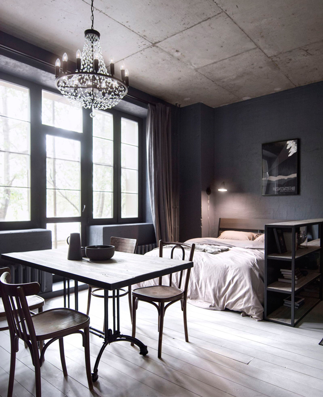 Гарри Нуриев, Crosby Studios. Перегородка из стекла и дерева выделяет кухню, спальное место просто отгорожено высокой ширмой. Наливной полимерный пол объединяет пространство лофта.