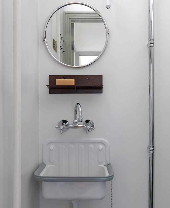 Пространство площадью 35 кв. метров включает две комнаты, кухню без окна и крошечный санузел, в котором также удалось оборудовать душ — в квартире не предусмотрена ванная комната и горячая вода. Существующую планировку оставили без изменений.