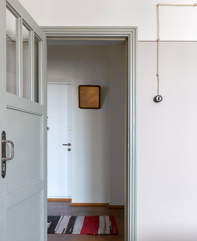 В ходе ремонта были восстановлены многие чудом сохранившиеся элементы первой трети XX века: оконные рамы, межкомнатные двери со стеклянными фрамугами, паркет. Сложно поверить, но на двух стенах даже сохранилась оригинальная покраска — цветовая палитра интерьера основана на оттенках, которые удалось найти благодаря реставрационным раскрытиям. Еще один интересный элемент интерьера — открытая проводка, которая является яркой приметой времени.