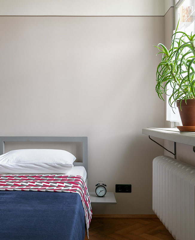Фрагмент спальни. Односпальные кровати сдвигаются в полноценное спальное место для двоих. Прототипом послужил объект «На переходном этапе» Е. И. Гужинской.