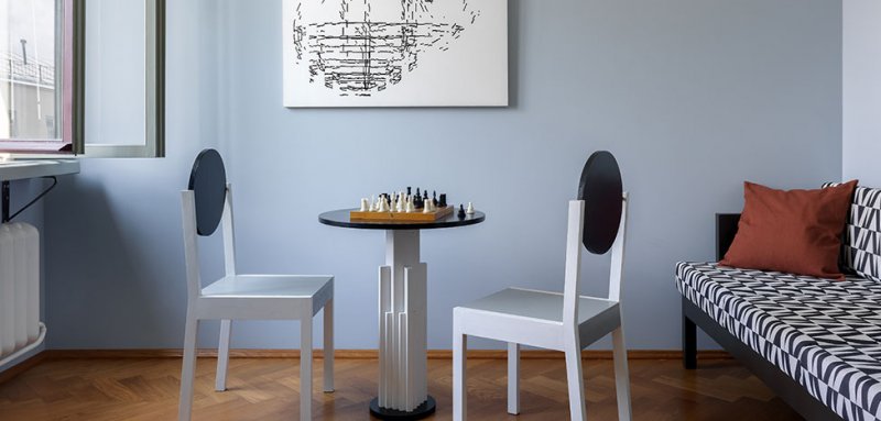 Жилкомбинат НКПС (Наркомат путей сообщения) был построен в 1932 году советскими архитекторами Иваном Николаевым и Алексеем Мешковым на Новой Басманной улице в Москве. Здание стало одним из крупнейших жилых комплексов периода авангарда — было запроектировано 511 квартир (для сравнения в «Доме на Набережной» — 500). В доме НКПС из каждого квадратного метра был выжат максимум пользы. Дизайнер Мария Пилипенко совместно с владельцами квартиры в доме НКПС Константином Гудковым и Александром Дудневым отремонтировала жилье площадью 35 кв. метров, бережно отреставрировав архитектурные элементы и наполнив аутентичной мебелью. Фрагмент гостиной. Диван «Черный и красный квадраты», инженер А. И. Фрицлер. Узор обивочной ткани создан по мотивам рисунка Любови Поповой. Фрагмент гостиной. Прототип шкафа — предмет из квартиры Николая Милютина в доме Наркомфина. На табурете — советская радиотарелка, Муромский радиозавод. Интерьер создавался специально для сдачи в аренду на сайте airnbnb. Квартиру для проекта специально искали с максимальным количеством сохранившихся деталей. Был найден вариант с оригинальной столяркой, паркетом и исходной планировкой. Константин Гудков и Александр Дуднев провели исследования и собрали архивную информацию. Авторы подчеркивают, что реализованный проект — не стилизация. Вероятно, это первый в России опыт по профессиональной реставрации жилого интерьера авангарда, который при этом не превратился в музей. Основная идея реконструкции — воссоздание обстановки, которая могла бы существовать в начале 1930-х годов. В проекте также принимали участие реставраторы Александр Серебряков и Екатерина Дмитриева (научная реставрация стен), директор Центра авангарда на Шаболовке Александра Селиванова. Фрагмент гостиной. Стол и стулья выполнены по эскизам Николая Суетина, студия Less. Картина, Александр Зайцев. Пространство площадью 35 кв. метров включает две комнаты, кухню без окна и крошечный санузел, в котором также удалось оборудовать душ — в квартире не предусмотрена ванная комната и горячая вода. Существующую планировку оставили без изменений. На окнах и дверях сохранилась оригинальная фурнитура. Коврик создан по рисунку Николая Суетина (1923), ручная работа, вологодский народный мастер. В ходе ремонта были восстановлены многие чудом сохранившиеся элементы первой трети XX века: оконные рамы, межкомнатные двери со стеклянными фрамугами, паркет. Сложно поверить, но на двух стенах даже сохранилась оригинальная покраска — цветовая палитра интерьера основана на оттенках, которые удалось найти благодаря реставрационным раскрытиям. Еще один интересный элемент интерьера — открытая проводка, которая является яркой приметой времени. Фрагмент спальни. Паттерн пледов повторяет эскизы Варвары Степановой. Предметы мебели создавались по образу реально существующих музейных экспонатов, разрабатывались по чертежам и эскизам советских авангардистов, восстанавливались по мутным фотографиям. При этом многие объекты до этого проекта существовали лишь в виде концептов. Например, столы, стулья, кровати и табуреты были созданы по образу моделей, экспонировавшихся на конкурсе советских дизайнеров 1932-го года. Фрагмент спальни. Односпальные кровати сдвигаются в полноценное спальное место для двоих. Прототипом послужил объект «На пе