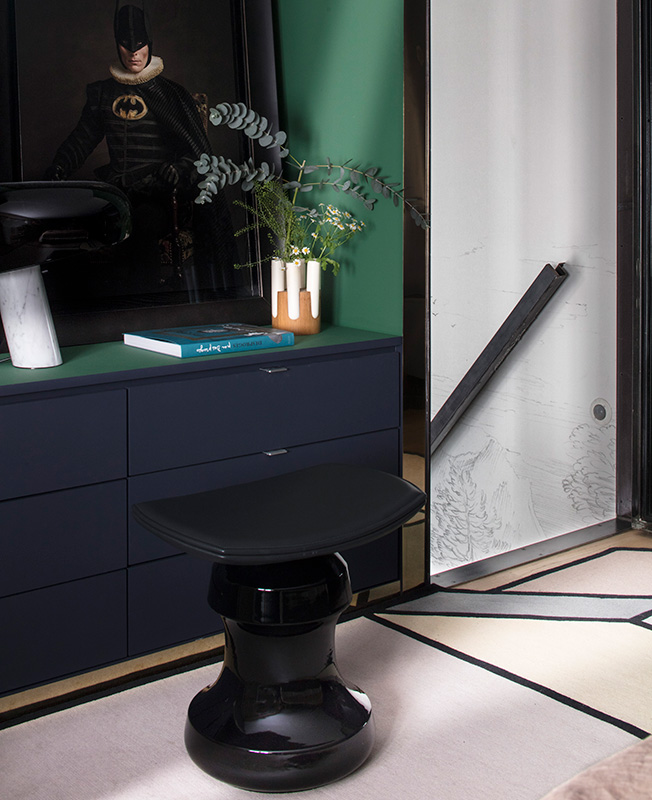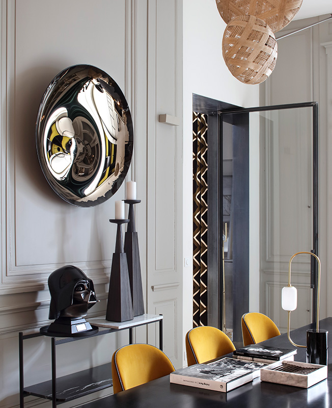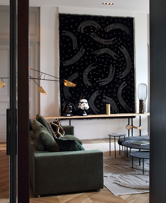 Декоратор Клод Картье, Claude Cartier Decoration, оформила двухуровневую квартиру в Лионе для бизнесмена-коллекционера. Достойное место в интерьере заняли предметы коллекционного дизайна, в том числе кресло Дениса Милованова, Gallerie Armel Soyer. Квартира площадью 250 кв. метров была несколько лет назад отреставрирована и структурирована архитектором Пьером Минассяном. Череду следующих друг за другом пространств открывает объединенная кухня-столовая, в которой кухонный остров и обеденный стол выстроены в одну линию. За ними — просторная гостиная. Белые стены, деревянный паркет на полу и элементы черного цвета служат нейтральным фоном для ярких акцентов: фактурных мебельных обивок, сочного оттенка штор, цветных оконных рам, контрастной отделки полок. Спокойную палитру поддерживает выбор материалов — панбетона, мрамора, древесины и стекла. В кухне-столовой стулья Gamfratesi для Gubi и Патрисии Уркиолы для Moroso соседствуют с деревянным креслом российского дизайнера Дениса Милованова (Galerie Armel Soyer). Другие знаковые оттенки в интерьере — глубокий темно-синий и изумрудно-зеленый Cartier, разработанный французским производителем красок Ressources специально для этого проекта. В эти тона выкрашена часть стен, их же поддерживает обивка мягкой мебели. Сиденье и спинка кресла H. Russell от Versant Edition в кабинете обиты изумудным бархатистым текстилем Pierre Fray. А зеленое асимметричное изголовье — самая выразительная деталь спальни. Его форма «ломает» пространство и рифмуется с узором ковра Visioni, спроектированного Патрисией Уркиолой для cc-tapis. Узнаваемые предметы, созданные мировыми профи, соседствуют с вещами, изготовленным французами: как, например, консоль длиной 4,5 метра в гостиной — объект дизайнера Кристофа Делькура, с которым Клод Картье работает не в первый раз. Ироничная деталь — отсылки ко вселенной киноэпопеи «Звездные войны»: шлемы Дарта Вейдера и имперского штурмовика на консолях, светильники, напоминающие макеты Солнечной системы, «космические» узоры ковров, портрет Чуббаки в стилистике фламандской живописи эпохи Ренессанса — как и портрет Женщины-кошки и Бэтмена, это часть проекта Super Flemish французского фотохудожника Саши Голдбергера (Sacha Goldberger).