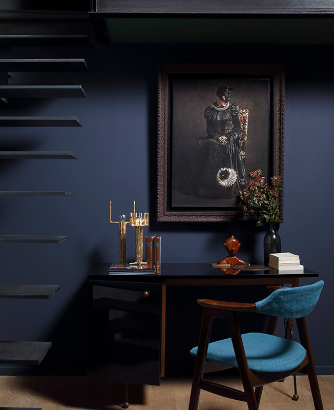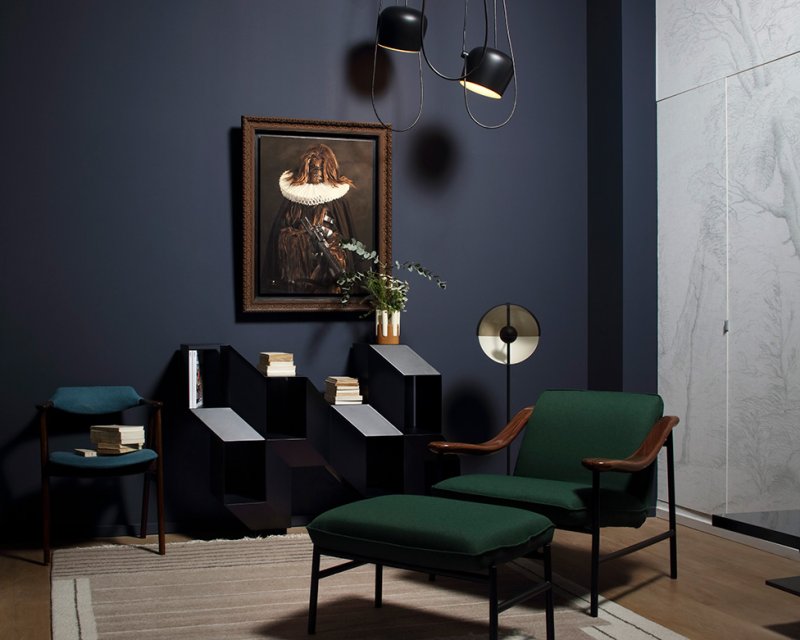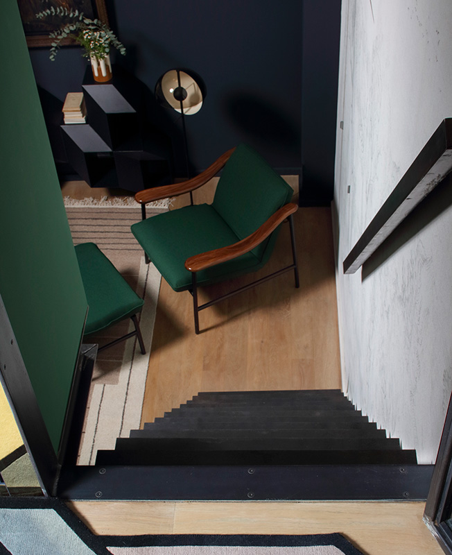 Другие знаковые оттенки в интерьере — глубокий темно-синий и изумрудно-зеленый Cartier, разработанный французским производителем красок Ressources специально для этого проекта. В эти тона выкрашена часть стен, их же поддерживает обивка мягкой мебели.