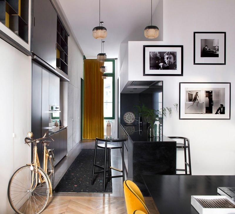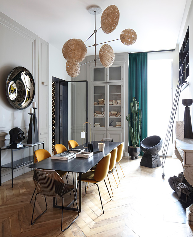 Квартира площадью 250 кв. метров была несколько лет назад отреставрирована и структурирована архитектором Пьером Минассяном. Череду следующих друг за другом пространств открывает объединенная кухня-столовая, в которой кухонный остров и обеденный стол выстроены в одну линию. За ними — просторная гостиная.