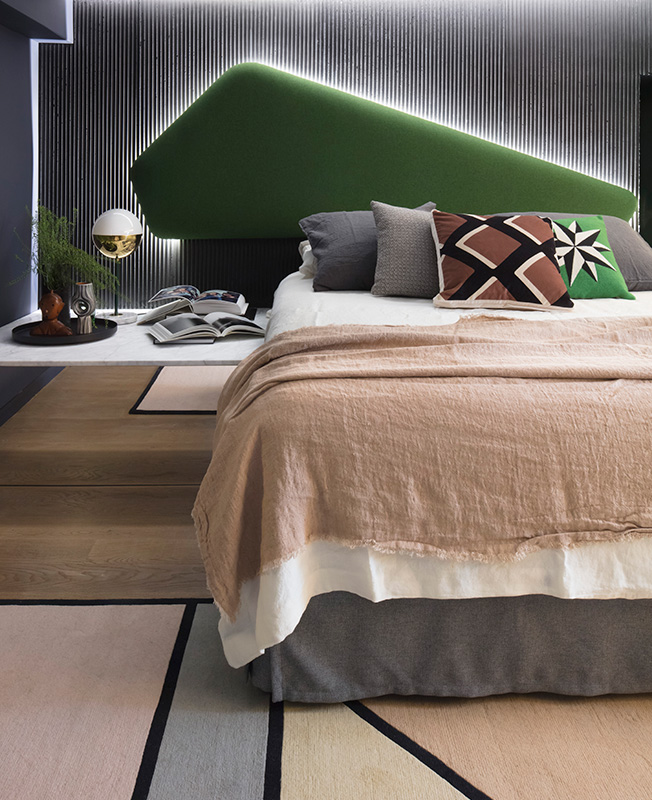 Сиденье и спинка кресла H. Russell от Versant Edition в кабинете обиты изумудным бархатистым текстилем Pierre Fray. А зеленое асимметричное изголовье — самая выразительная деталь спальни. Его форма «ломает» пространство и рифмуется с узором ковра Visioni, спроектированного Патрисией Уркиолой для cc-tapis.