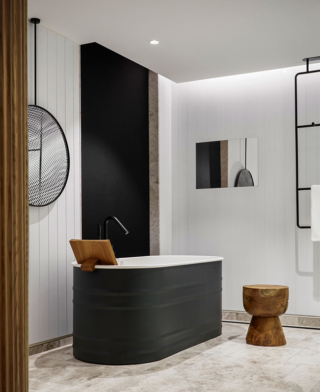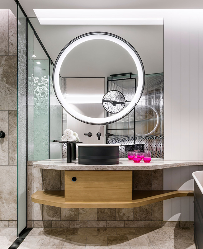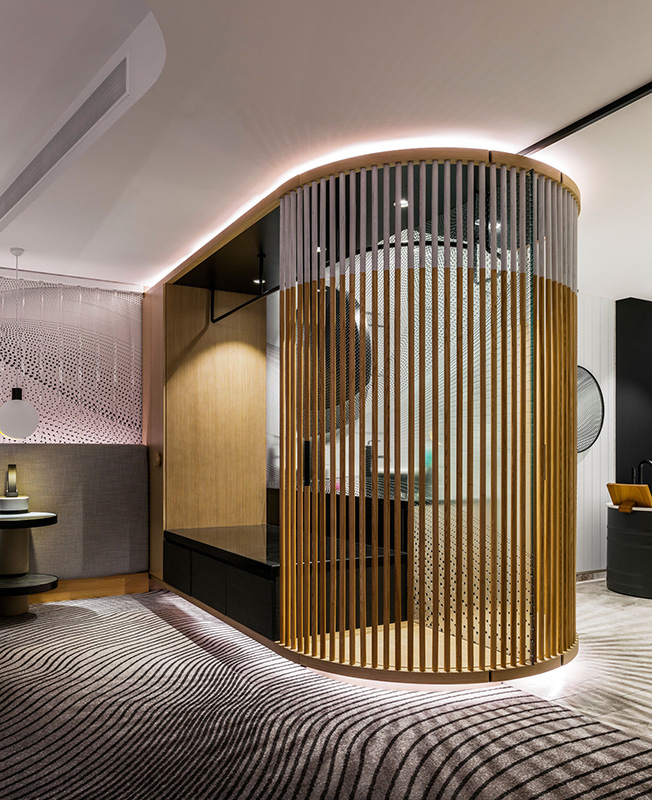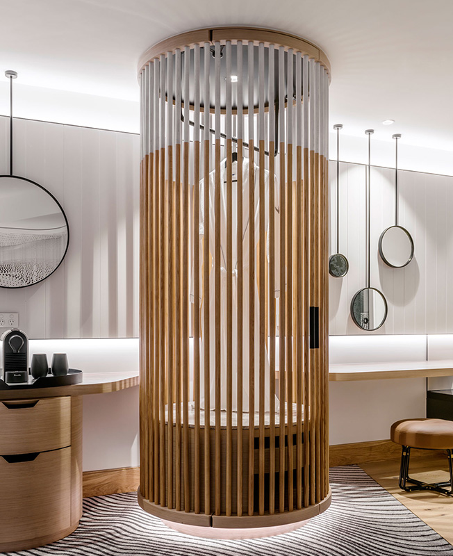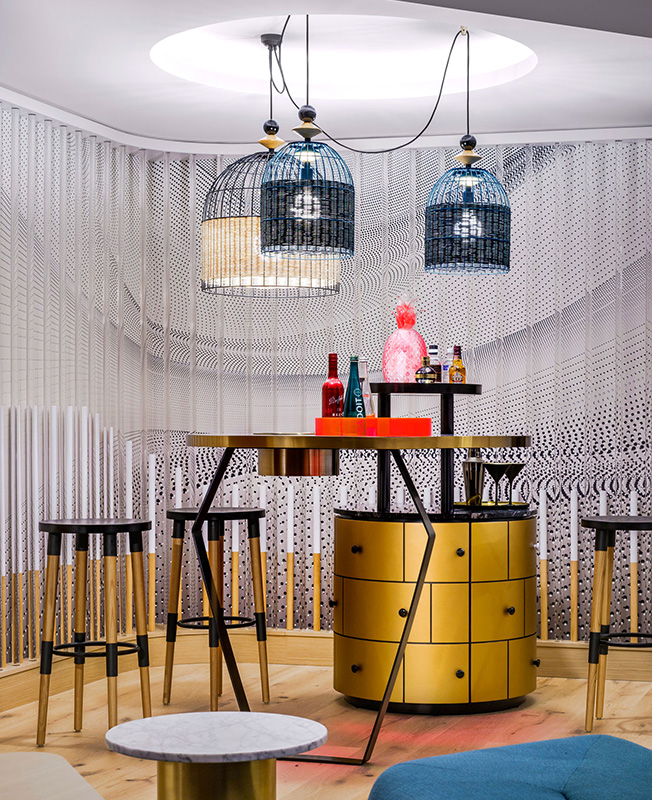 Почти 90 процентов мебели для отеля было выполнено на заказ. Среди ярких моделей — округлый решетчатый шкаф. «Напоминающие птичьи клетки шкафы у многих вызвали любопытство, — комментирует дизайнер. — А сколько селфи в них было сделано! Но это не столько клетка, сколько способ по-другому исследовать комнату: создать скульптурный объект из предмета, который обычно стоит вплотную к стене».