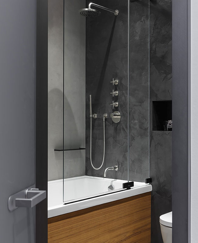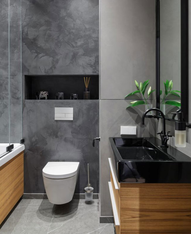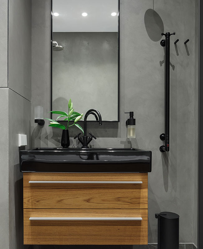 В ванной комнате решили отказаться от плитки и использовать на стенах штукатурку. Отделка имитирует поверхность бетона, для практичности покрыта специальным водоотталкивающим лаком. Для мебели была использована древесина тика из-за своей невосприимчивости к влаге.