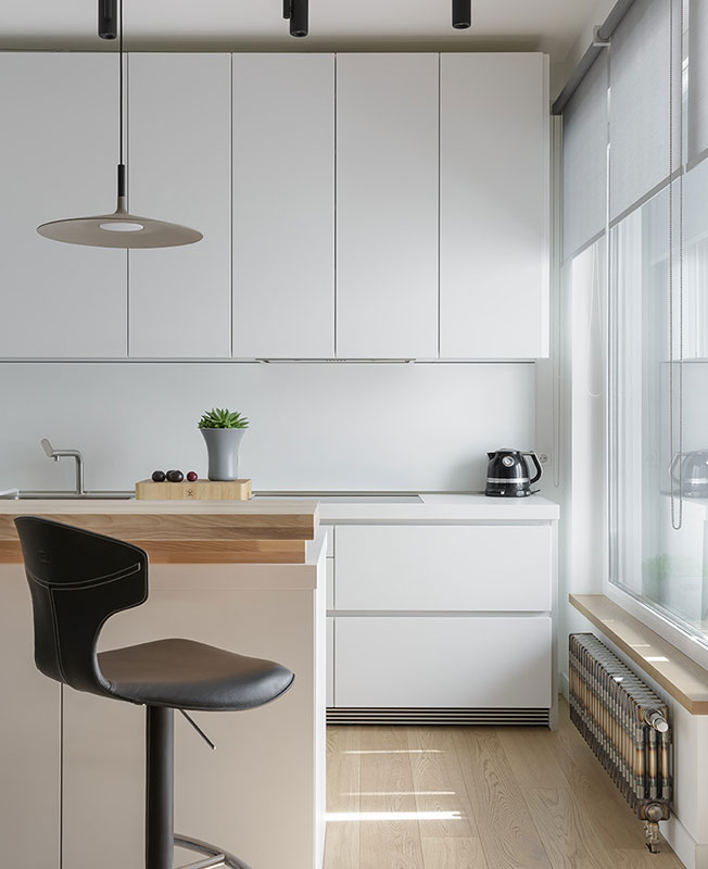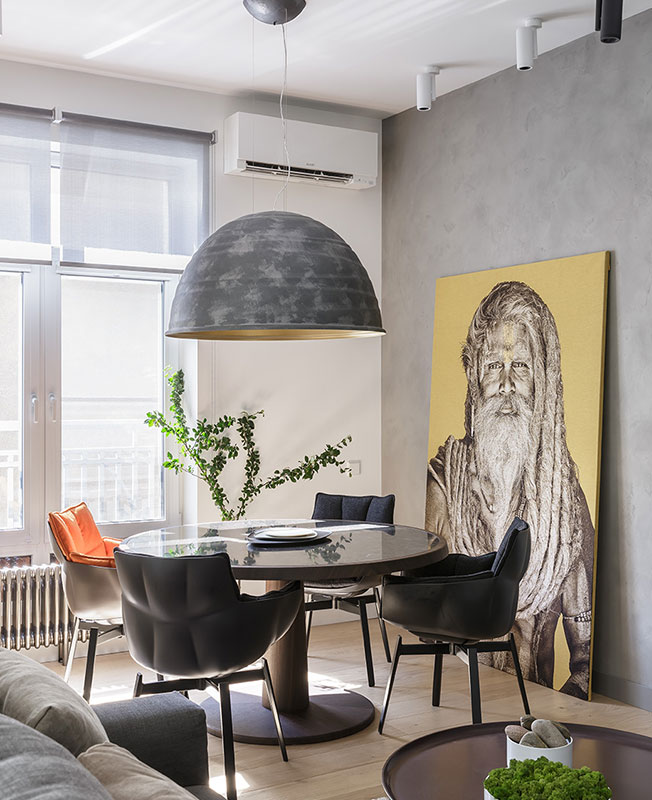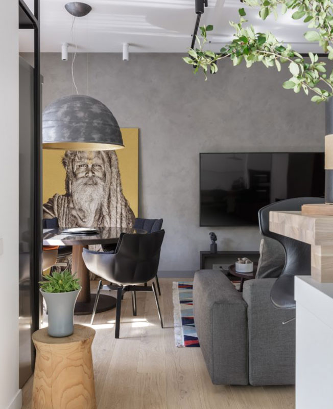 В петербургской квартире, площадью 72 кв. метра, дизайнер Анна Иванова, Omnia-studio, реализовала несколько оригинальных решений. Заказчики были не против создать современный минималистичный интерьер. Вкусы владельцев и автора проекта настолько совпадали, что Анну не покидало чувство, что пространство она оформляет для себя. Фрагмент кухни. Светильники над островом Aplomb, Foscarini. https://vk.com/omniadesignstudiohttps://www.instagram.com/omniastudio/https://www.facebook.com/omniastudiodesign/http://omnia-studio.com/ «Заказчики постоянно упрощали и сводили к минимуму все идеи. В результате в пространстве не осталось ничего лишнего. Лаконичный интерьер дополнен лишь небольшим количеством декоративных элементов», — комментирует проекта Анна. Кухня. Кухонный остров стал местом притяжения друзей, которые очень часто приходят к гостеприимным хозяевам. Кухня B1, Bulthaup. Барные стулья Montera, Poltrona Frau. Большой холодильник был одним из главных пожеланий владельцев — хозяйка очень любит готовить для семьи и друзей. Однако масштабный бытовой прибор не помещался на кухне, т.к. там уже был задуман остров. Место для холодильника нашлось у окна в столовой. Объединенная кухня-гостиная-столовая. Полки над холодильником, Rimadesio. Журнальные столики Pathos, B