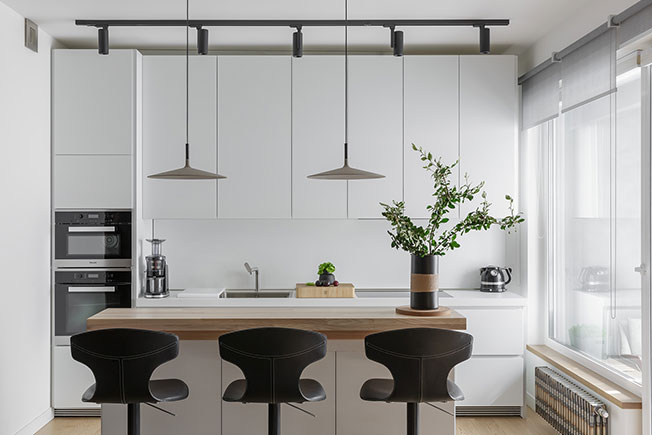 Фрагмент кухни. Светильники над островом Aplomb, Foscarini. https://vk.com/omniadesignstudiohttps://www.instagram.com/omniastudio/https://www.facebook.com/omniastudiodesign/http://omnia-studio.com/