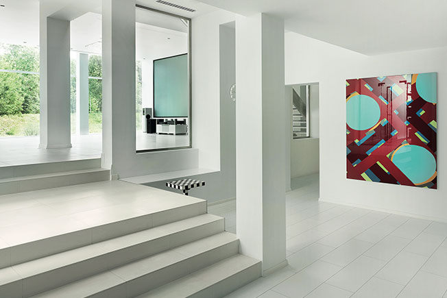 Один из немногих цветных акцентов в доме — работа М. Веггенмана «Без названия» (2008). Алюминий, высокоглянцевые лаки. Экран домашнего кинотеатра 4,5 х 2, 5 м воспринимается как произведение концептуального искусства.