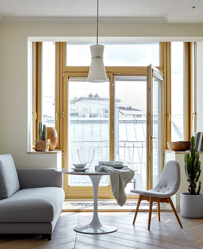 Владелица квартиры очень много работает. Чтобы не посадить зрение, врачи рекомендуют время от времени отвлекаться от экрана компьютера и переводить взгляд. Место для банкетки в гостиной было выбрано так, чтобы сидя на ней любоваться окрестными крышами.