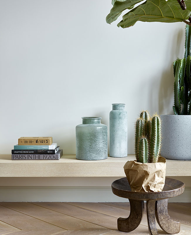 Вид из гостиной на холл. Скамья выполнена на заказ по эскизу архитектора. Вазы Mirtus, Arcade.