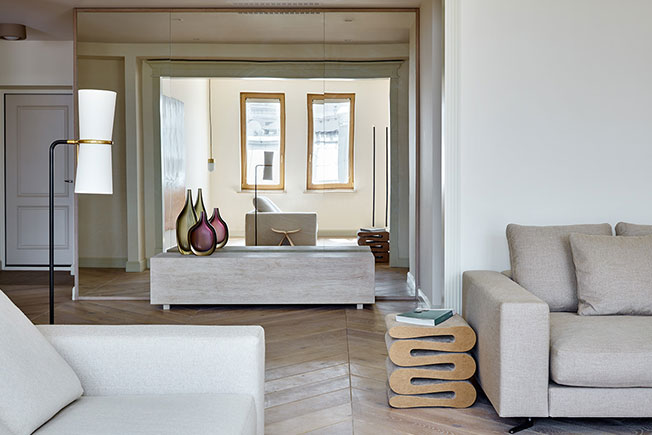 Гостиная. Диваны, Minotti. Табурет, Vitra. Напольные светильники Flos и Visual Comfort & Co. Скамья выполнена по эскизам архитектора, Ассоциация русских мастеров.