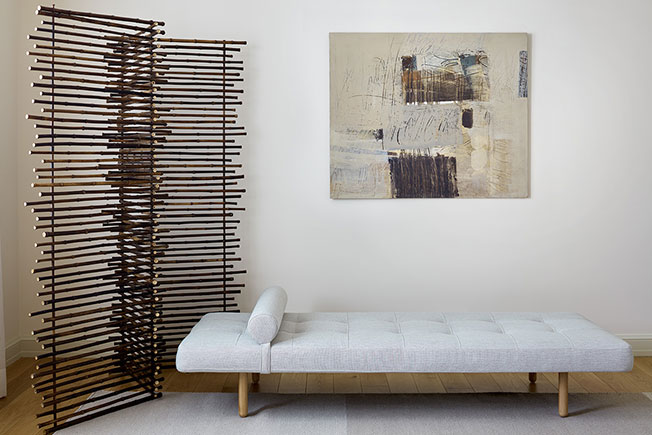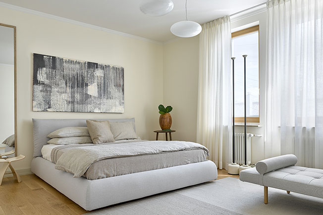Фрагмент спальни. Банкетка, Innovation. Ширма, Gervasoni. Ковер, Muuto. Картина «Дзен», Ольга Шагина.