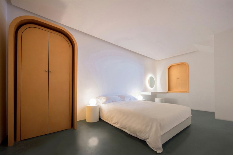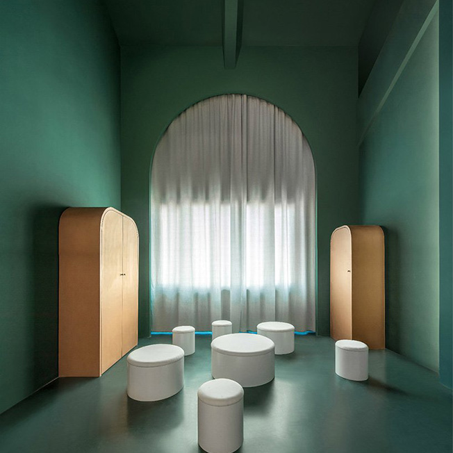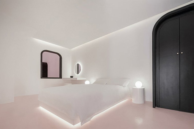 Монохроматические интерьеры подчинены цветовому лабиринту: есть зеленые комнаты, бледно-розовые и белые. Все вместе они обозначают переход от сна к бодроствованию. Оборудование и осветительные приборы скрыты за панелями и крупным обрамлением дверных проемов, выделенных черным цветом.
