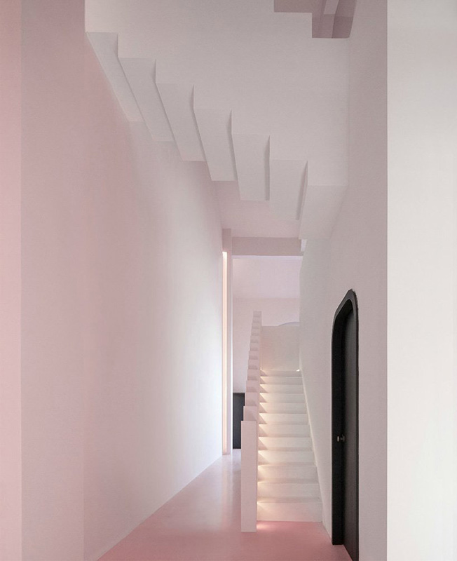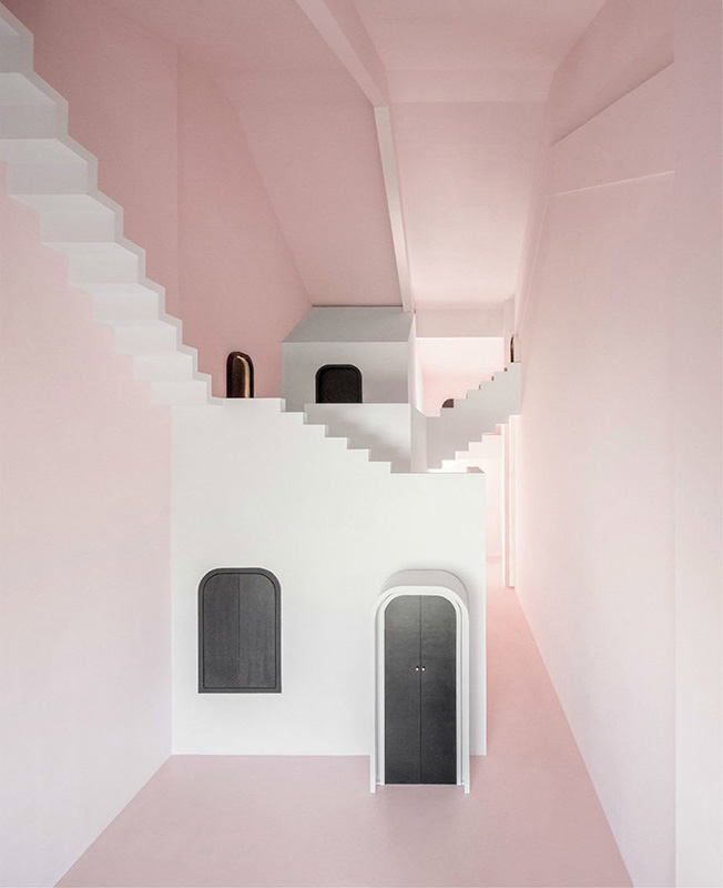Китайские проектировщики Studio 10 с офисами в Шэньчжэне, Гонконге и Нью-Йорке cоздали отель. Его розовые и зеленые интерьеры вдохновлены «невозможной архитектурой» голландского графика Маурица Корнелиса Эшера, мастера оптических иллюзий. Дом, построенный для отельеров The Other Place Guilin Litopia находится в живописном Гулине, курортной провинции Гуанси на юге Китая и занимает площадь 1588 кв. метров. Студия под руководством Ши Жу (Shi Zhou) отремонтировала существующие комнаты гостевого дома так, чтобы создать «таинственное, бесконечное и невозможное пространство» со множеством оптических иллюзий. Монохроматические интерьеры подчинены цветовому лабиринту: есть зеленые комнаты, бледно-розовые и белые. Все вместе они обозначают переход от сна к бодроствованию. Оборудование и осветительные приборы скрыты за панелями и крупным обрамлением дверных проемов, выделенных черным цветом. «Математики открыли дверь, ведущую в другой мир, но сами войти в этот мир не решились. Их больше интересует путь, на котором стоит дверь, чем сад, лежащий за ней», — считал Мауриц Эшер (1898-1972) . Оказалось, что с помощью работ Эшера можно объяснить такие математические понятия, как: фракталы, параллельный перенос, квазипериодичность и пр. Самым важным для Эшера считаются его 20-метровые «Метаморфозы», картины, на которых логика пространства и времени нарушается, а городской пейзаж превращается в шахматную доску. Визуальные трансформации, столь точно изображенные Эшером без компьюторного моделирования востребованы сегодня у архитекторов всех континетов и рас. «Вдохновленные трудами М.К. Эшера, мы хотели создать загадочное, бесконечное и невозможное пространство с плавным преобразованием 2D в 3D, — пишут архитекторы Studio 10. — Антигравитационная лестница ведет к черным дверям, которые может быть приведут в секретный сад».