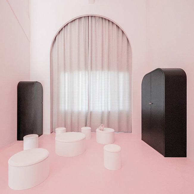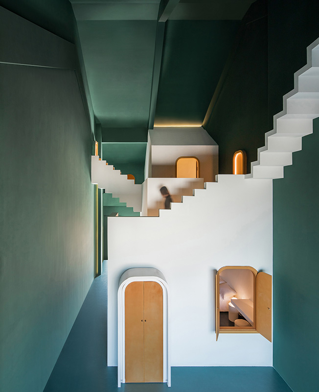 Китайские проектировщики Studio 10 с офисами в Шэньчжэне, Гонконге и Нью-Йорке cоздали отель. Его розовые и зеленые интерьеры вдохновлены «невозможной архитектурой» голландского графика Маурица Корнелиса Эшера, мастера оптических иллюзий.