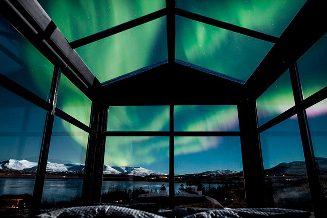 Потрясающий визуальный эффект удваивается, так как павильон Panorama Glass Lodge стоит на берегу моря, а небесные красоты отражаются в водной глади. Если повезет, можно обнаружить загорающих на пляже тюленей или китов. Мини-отель расположен за 30 минутах езды от Рейкьявика. Внутри, на 23 кв. метров — небольшая оборудованная кухня и все удобства включая тропический душ в ванной.• От 340 евро за ночь.