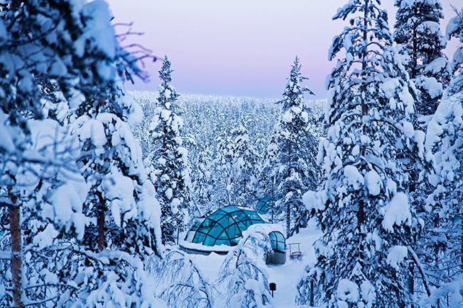 Туристический комплекс Kakslauttanen в Лапландии, за полярным кругом, предлагает гостям пожить в одном из двадцати стеклянных иглу, сквозь прозрачный потолок которых можно любоваться звездным небом. Наиболее высокие шансы увидеть северное сияние в период с конца августа по конец апреля. Когда свечение становится видимым туристов информирует об этом специальный гонг. • От 200 евро за ночь