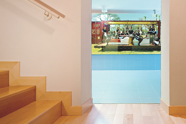 Массажная комната при зоне спа. Отделка из мелкой плитки напоминает о прошлых десятилетиях, когда гремела слава Соттсасса. На стене — кинетическая скульптура Ф. Стеллы.
