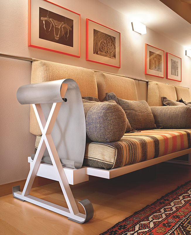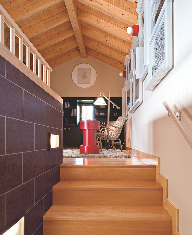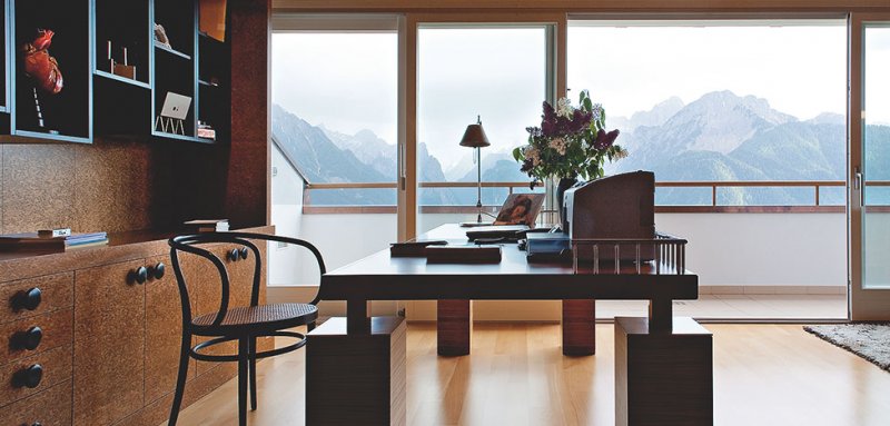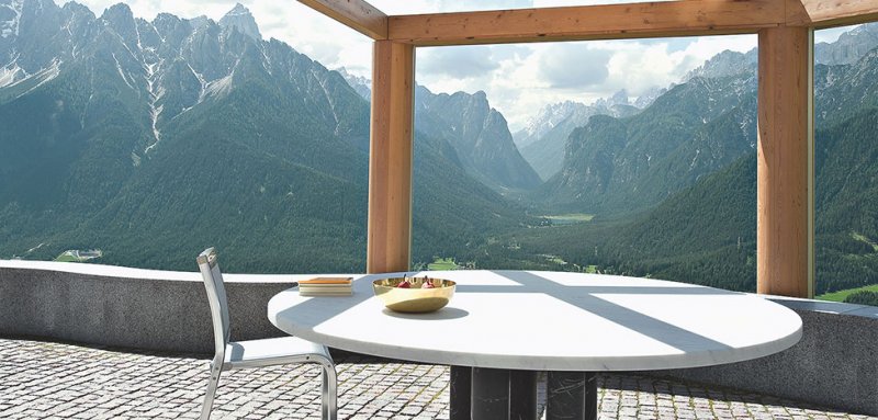 Сохранены и маленькие окна, характерные для местной архитектуры. В то же время альпийская аутентичность оживлена сильными современными знаками. Например, вместо типичного деревянного балкончика над входом появился широкий карниз из оксидированной меди. Его поддерживают две массивные колонны из черного мрамора. Тема «столпа» продолжается и внутри: по дому расставлены характерные столики Этторе Соттсасса.