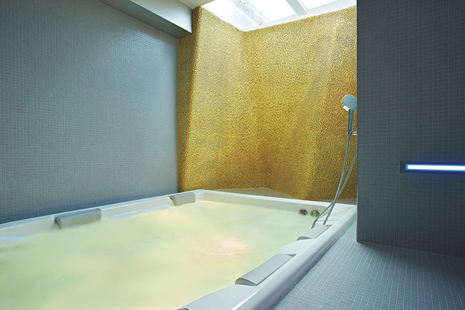 Соттсасс всегда был неравнодушен к ярким поверхностям. Для стены в спа-зоне он использовал мелкую позолоченную гальку, вмонтировав ее в цементную основу.