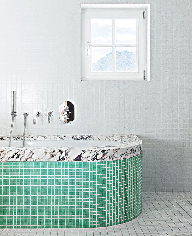 Ванная комната хотя и с маленьким, но с окном. В нем вид Доломитовых Альп. Очень красиво сочетание рисунка мрамора с мелкими квадратами плитки.