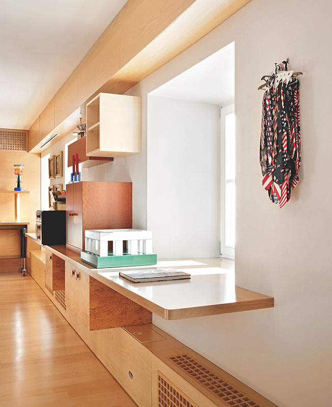 Сложная система хранения спроектирована специально для дома. В отличие от стеллажей периода Memphis'а этот не такой яркий и веселый, зато абсолютно функциональный: еще и маскирует вентиляционную решетку.