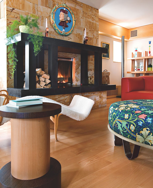 Вокруг камина — живописная группа. Здесь и деревенское искусство, и мебель финского классика А. Аалто, и пуф с мотивами ар нуво. На стеллаже справа — уменьшенная копия стеллажа Carlton, созданного для Memphis в 1981 г.