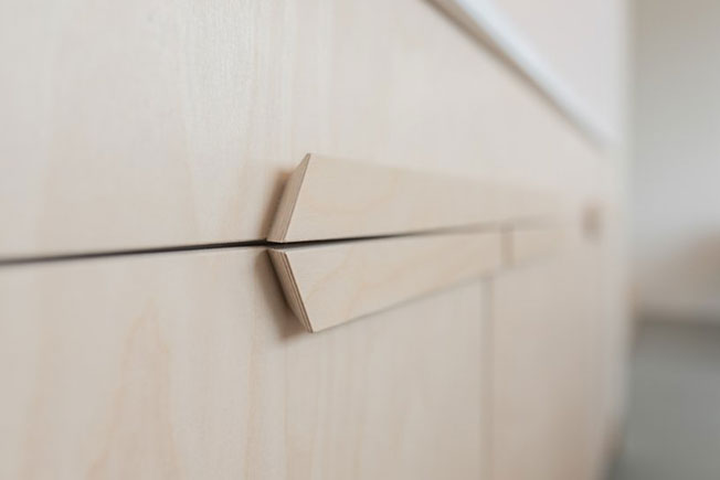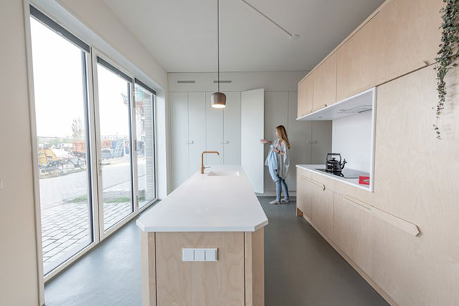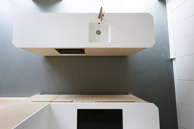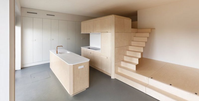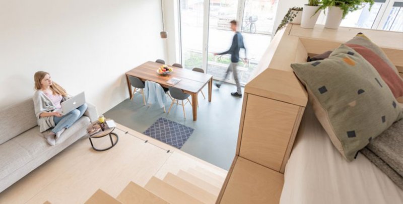 Голландская студия Heren 5 и дизайнер Пол Тиммер (Paul Timmer) оформили пространство 45 кв. метров в Амстердаме. Интересные решения позволили создать в стандартном помещении многоуровневые жилые зоны. Панорамные окна занимают всю переднюю стену квартиры на первом этаже и выходят прямо на пешеходную дорожку, поэтому сразу за стеклом расположена гостиная и столовая, а личные скрыты от глаз пешеходов. Архитекторы использовали высокие потолки (3,5 м), чтобы разместить кровать над кухней. Спальню подняли на высокую платформу, куда можно подняться по красивым визуально легким ступенькам. Всю корпусную мебель и системы хранения архитектор проектировал по месту. Санузел находится за кухней. Зона гостиной приподнята на подиум (в нем скрыта дополнительная кровать для гостей), для того, чтобы отделить ее от зоны столовой, которая находится непосредственно у окна. Вместо штор — жалюзи.