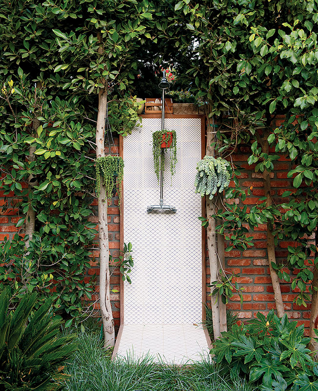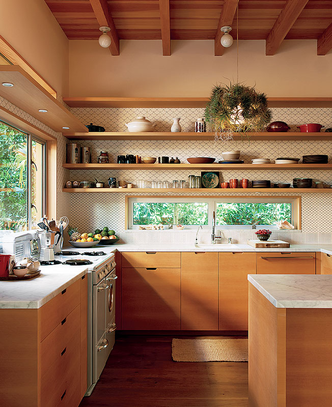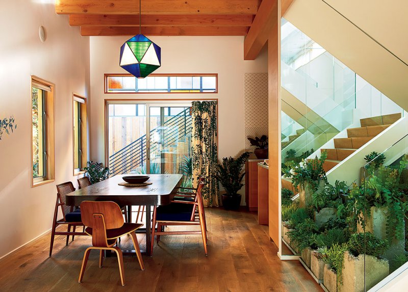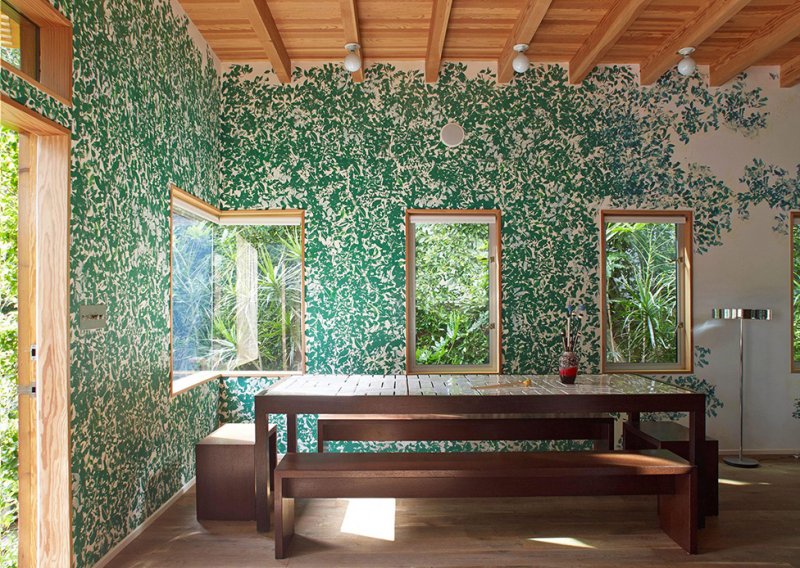Богатый сложный узор листвы на стенах сливается с зеленью сада, в бетонных кашпо растут неприхотливые суккуленты. На крыше устроен сад — оттуда открывается вид на Тихий океан, который плещется всего в квартале от дома. Светильник на кухне опутан тропическими эпифитами — они питаются влагой из воздуха, в изобилии возникающей во время готовки. Внутри и снаружи дом отделан натуральным деревом, тот же материал преобладает в мебели.