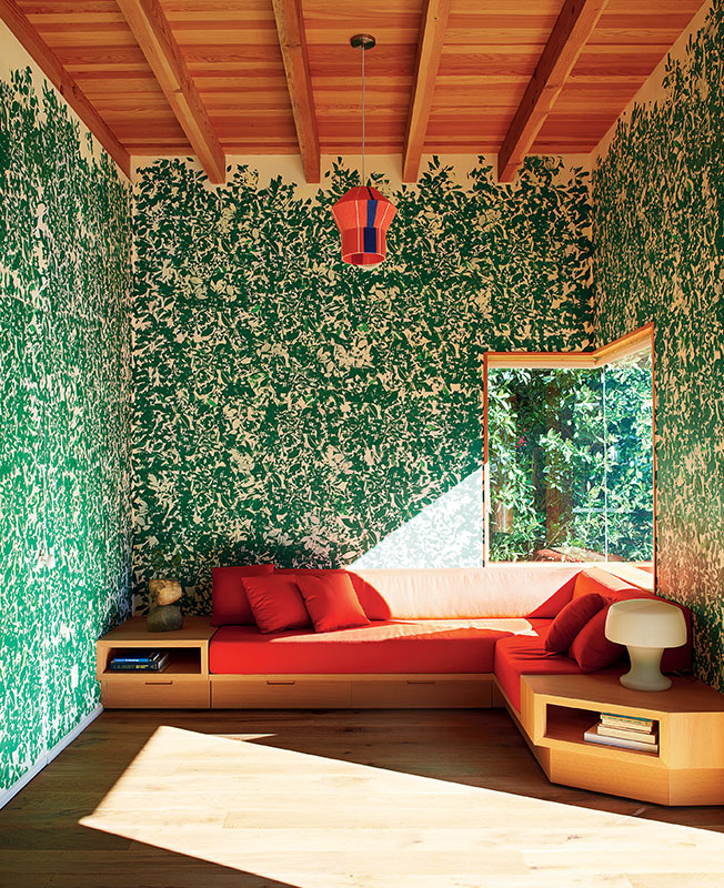 Зеленые кущи в технике шелкографии сливаются с настоящими за окном. Диван спроектирован Дугом Эйткеном. Слева в стене скрыта дверь в спальню.