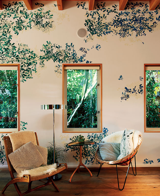 Фасад с эркером. На плоской крыше устроена терраса с садом. Как живет художник? Дуг Эйткен ставит над собой эксперимент в Калифорнии. «Нет различия между создаваемыми мною работами и миром, в котором я живу», — заявляет Дуг Эйткен. И это чистая правда. Дуг из тех художников, что ищут новый язык XXI века. Обладатель «Золотого льва» Венецианской биеннале, Эйткен работает в скульптуре, фотографии, пишет книги, устраивает масштабные хэппенинги. Но наиболее интересны его высказывания в видеоарте. Особый проект Дуга — его собственный дом: тотальная инсталляция на стыке архитектуры, дизайна и арта под названием Acid Modernism (acid переводится как «кислотный»). «Мы искали новое направление в модернизме — галлюцинаторное, дающее богатые ощущения, будоражащее органы чувств». В столовой установлен «звуковой стол». Справа — лестничная клетка, облицованная зеркалами, — они превращают ее в сияющий калейдоскоп. В столовой установлен «звуковой стол». Справа — лестничная клетка, облицованная зеркалами, — они превращают ее в сияющий калейдоскоп. Как автор достигает эффекта? Девять геомикрофонов, внедренных в почву под фундаментом, передают звуки движения тектонических пластов, шум приливов и отливов, голоса улицы. Динамики, установленные по всему дому, воспроизводят равномерные щелчки и гудение, стоит хозяину прибавить громкость. Шесть других микрофонов встроены под лестницей, отчего та превращается в гигантский ударный инструмент. Для желающих отстучать ритм хозяин держит легкие молоточки, но гости могут использовать и собственные ноги. Кроме того, наиграть мелодию можно на двух акустических столах, звучанием напоминающих ксилофоны. Зеленые кущи в технике шелкографии сливаются с настоящими за окном. Диван спроектирован Дугом Эйткеном. Слева в стене скрыта дверь в спальню. Лестничная клетка облицована прямоугольными зеркалами, превращающими ее в сияющий калейдоскоп. «В таком окружении легко потерять связь с реальностью, — констатирует хозяин. — В то же время ничто не стимулирует так, как дом, в котором можно экспериментировать. Уверен, что через год здесь произойдут изменения». Контрастом к галлюцинаторному звучанию дома выступает его земной теплый облик: открытые деревянные балки, дощатый пол, мебельная классика XX в., например кресла Х. Вегнера. Несмотря на авангардную начинку, дом приспособлен для комфортной жизни. Эйткен называет свой Acid Modernism «теплым, органическим, негламурным». «Как объединить интерьер с окружением? Как заключить внешний мир в раму архитектуры? Создать дом мечты, где материалы и пространство не вступают в противоречие с природой, а сотрудничают с ней? Вот вопросы, которые сильно волновали нас». Новый дом Дуг создавал с подругой Джеммой Понсой — они вместе шесть лет. Джемма ведет испаноязычные кулинарые телешоу. Над кроватью — работа Future (2012) хозяина дома. Богатый сложный узор листвы на стенах сливается с зеленью сада, в бетонных кашпо растут неприхотливые суккуленты. На крыше устроен сад — оттуда открывается вид на Тихий океан, который плещется всего в квартале от дома. Светильник на кухне опутан тропическими эпифитами — они питаются влагой из воздуха, в изобилии возникающей во время готовки. Внутри и снаружи дом отделан натуральным деревом, тот же материал преобладает в мебели. Стеллаж, перетекающий в комод, а зате