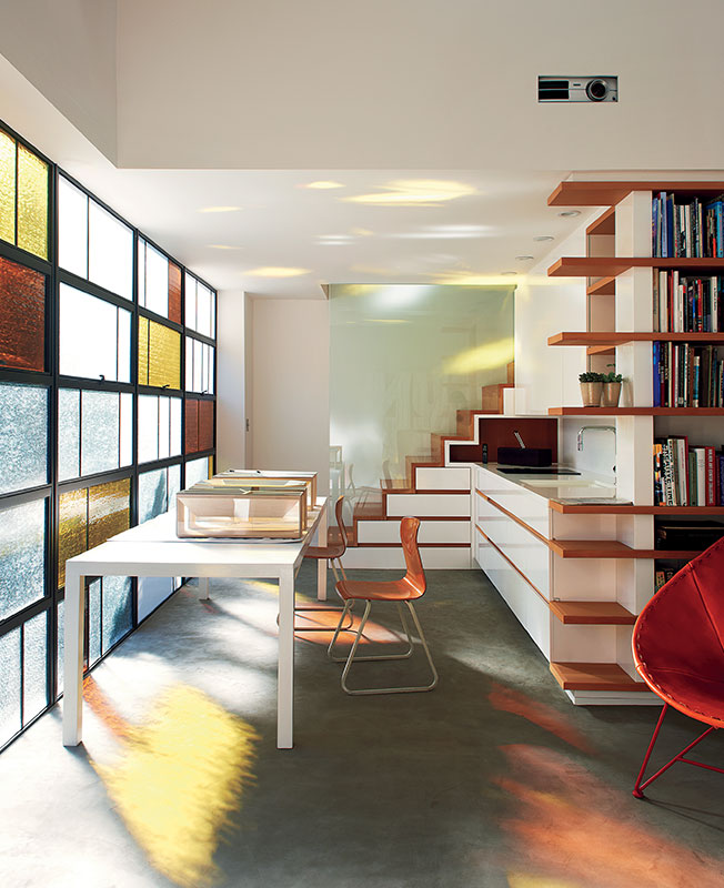 Дипломированный художник Эйткен оказался талантливым дизайнером. Спроектировал удачную, будто вырастающую из стен мебель. Его подруга Джемма Понса особенно гордится потайными дверями. Одна скрыта в шелкографической растительности, другая замаскирована под книжный стеллаж. Чтобы ее открыть, надо взять с полки том «Улисс» Джойса — он оказывается намертво закрепленной ручкой. «Выглядит совсем как книга», — радуется Понса.
