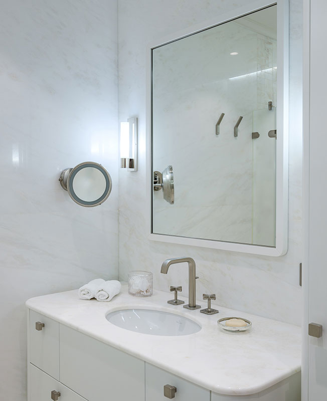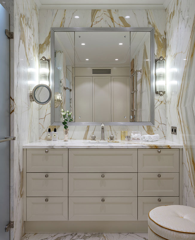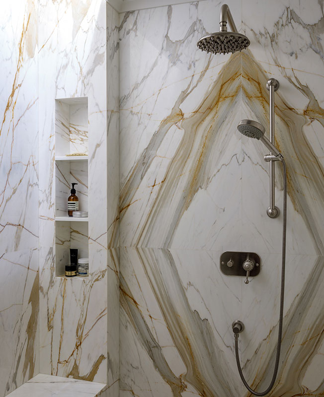 Ванная комната. Душевая система, THG. Стены и пол, каррарский мрамор с рисунком «бабочка».
