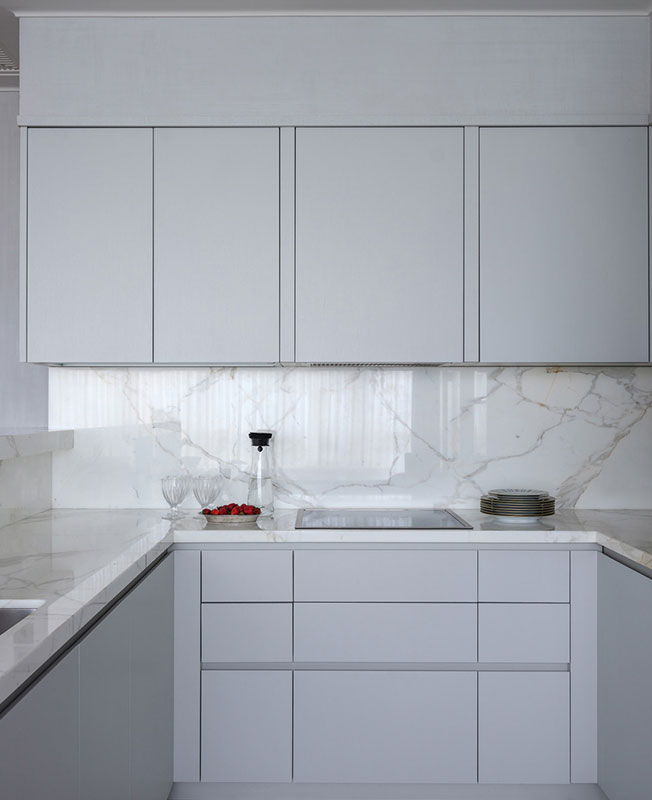 Фрагмент кухни. Кухня Varenna, Poliform. Столешница и фартук в отделке натуральным мрамором.